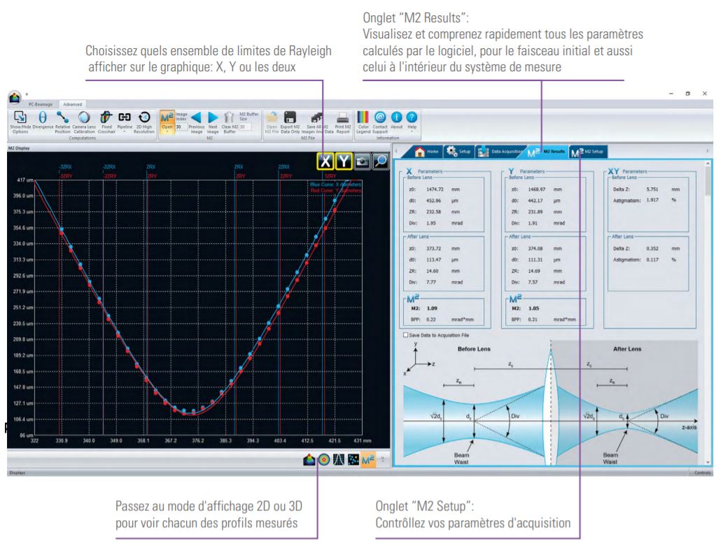 Lorsque vous utilisez le bouton “RUN M2 SETUP”, le logiciel établit automatiquement les nouveaux paramètres pour une mesure de M2 plus précise. L’ensemble des données se conforme aux standards ISO-11146 de mesure M2, étant répandus de 3ZR à +3ZR.