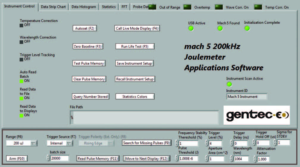 Our powerful LabView application software includes many unique control and diagnostic features. The instrument control screen, shown on the left, is used to set up the operation of the MACH 6, including range, trigger, wavelength, and more. In addition, it is used to set a pulse batch size and to arm the instrument, which starts the data collection. It also gives you access to features like "autoset", "call live mode", "run life test", "save instrument setup" and the like. These features can be accessed by clicking directly on the feature or pushing the associated function key.