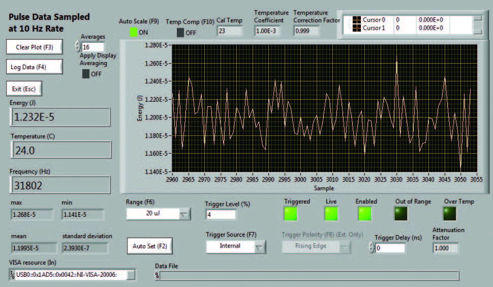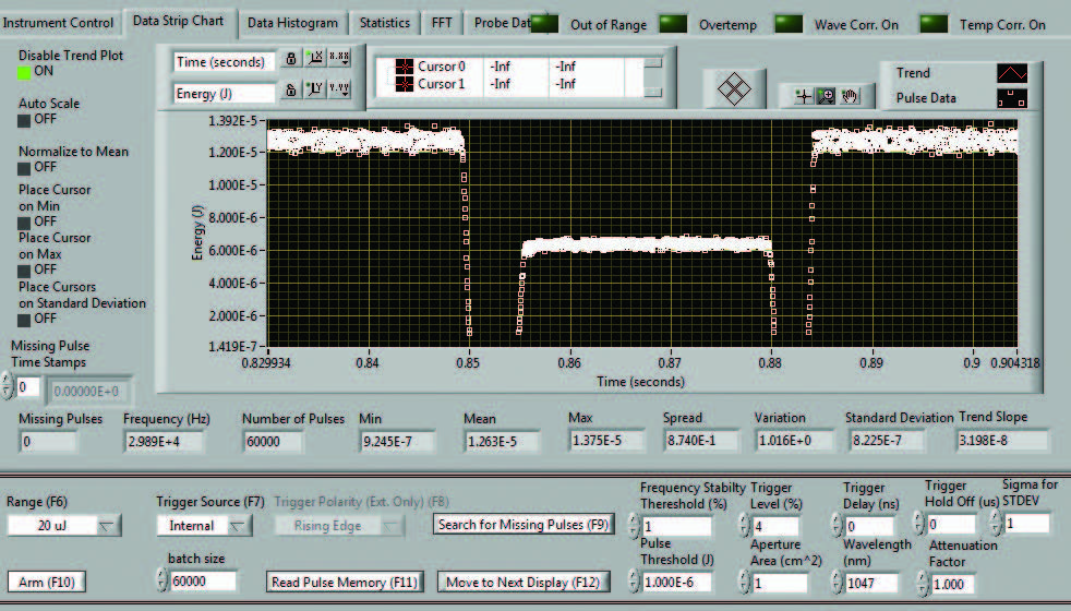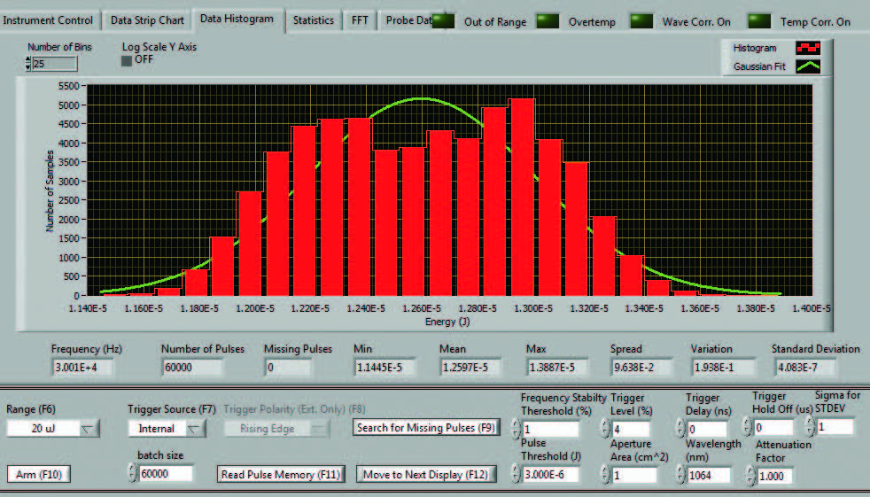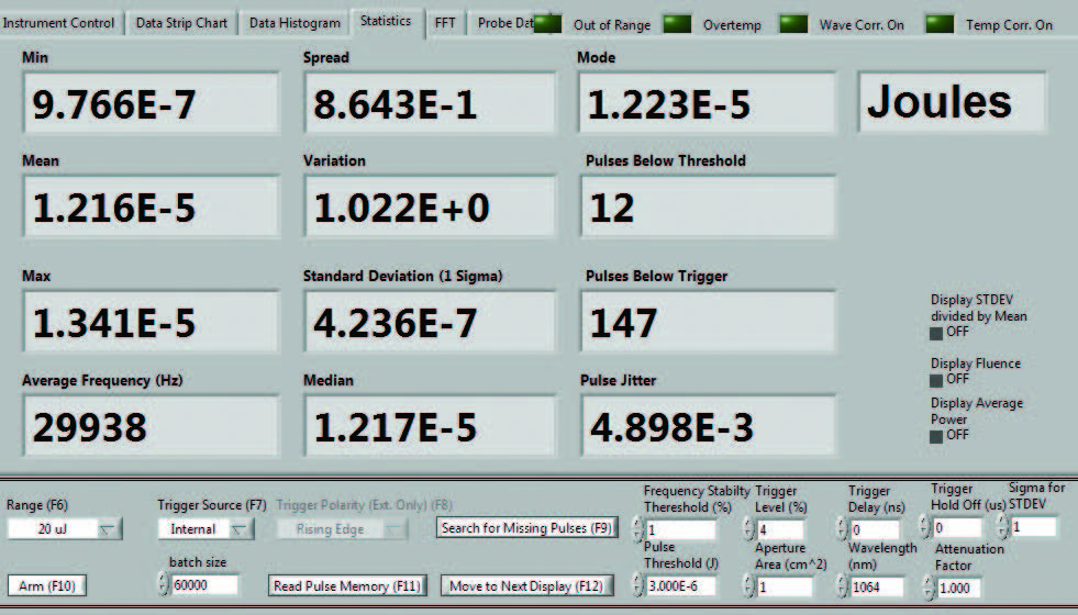 Interested in viewing the statistical distribution of the pulse energy data set? The Histogram screen does this for you and fits a "best Gaussian curve" to the data. It displays complete statistical calculations along the bottom of the graph, along with pulse frequency. Just below the statistics, you will find instrument controls, like range and trigger. You are also given the ability to adjust trigger delay and hold off as needed.
