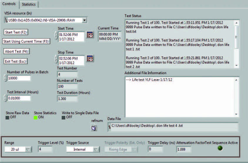 Would you like to run a life test on your high repetition rate pulsed laser? How about a periodic test vs an environmental change like temperature? We have included a great feature to accomplish this. In the life test screen, we give you the ability to select the statistics you want, a start time and date, a stop time and date, the number of pulses and a test interval. You simply identify a file, a place to put the data, and then click on start and walk away! When you come back, you have a data set that tracked the performance of your laser over time, temperature, shock, vibration or anything you chose.