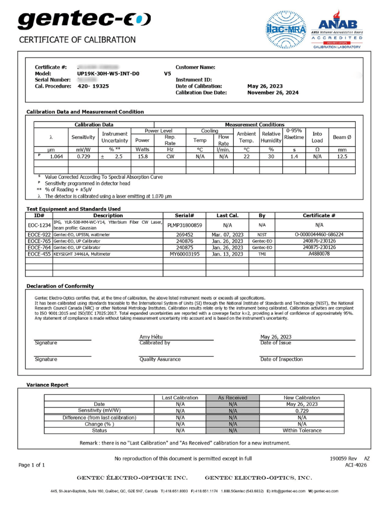 Another important parameter to verify, and one that is less known, is the confidence level. At Gentec-EO, we use a very high confidence level of 95%. Like every other step in the calibration process, our uncertainty calculations are done rigorously.