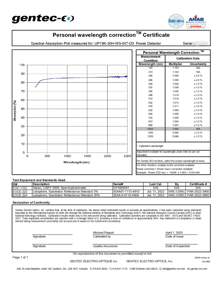Each Gentec-EO detector comes with a Personal Wavelength Correction Certificate. The correction factors are based on measurements that were made with YOUR detector. They are not based on the general curve of the absorbing material or the general response of equivalent products. This means you get the best wavelength correction tool available on the market. This data is stored in the Smart Interface of your Gentec-EO detector, you just have to select the wavelength in your monitor to get the most precise laser measurements on the market.