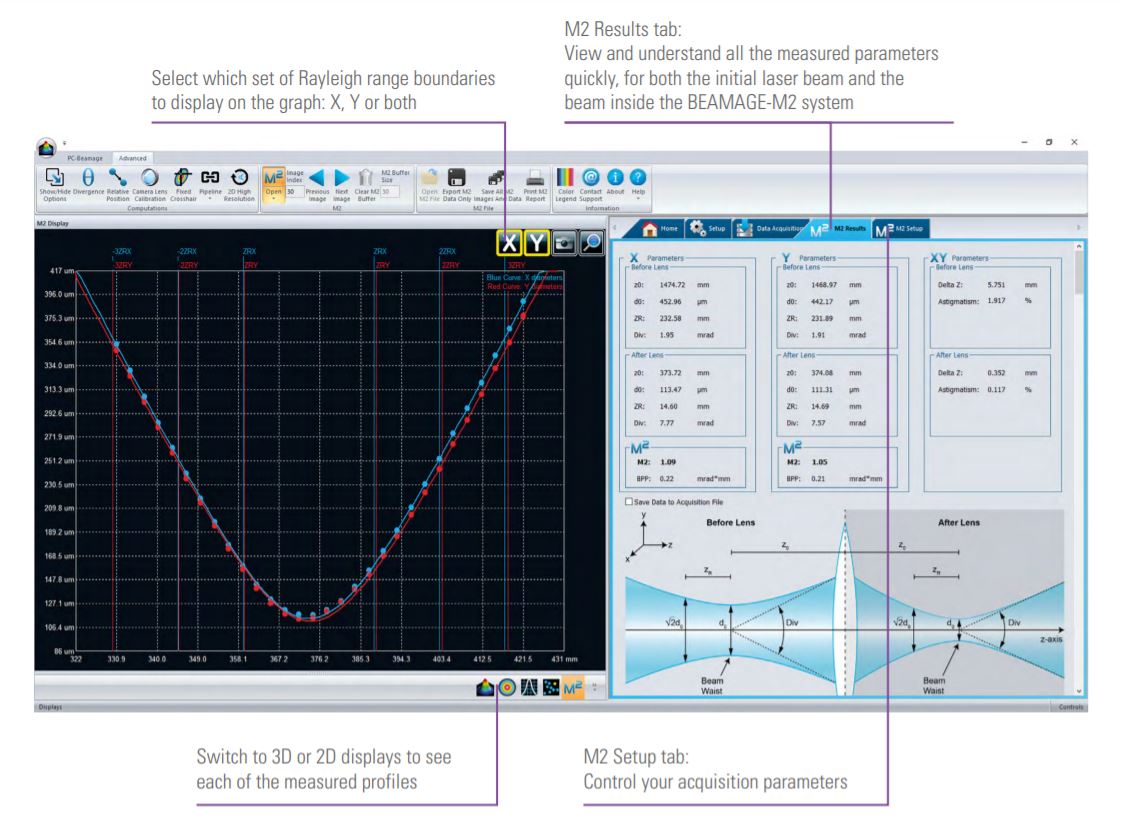 The calculations are fully compliant with the ISO 11146 and 13694 standards.