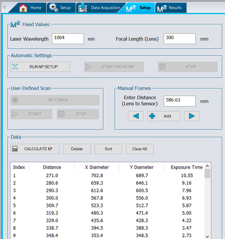 With the “RUN M2 SETUP” button, the software automatically defines new parameters for a more precise M2 measurement. The “ISO SCAN” data set complies with the ISO-11146 M2 measurement standard, being spread between -3ZR and +3ZR.
