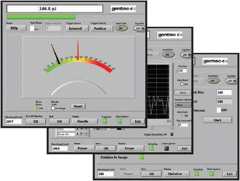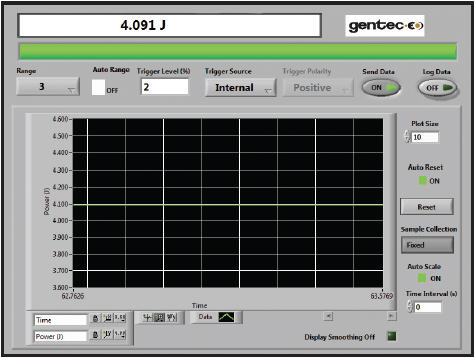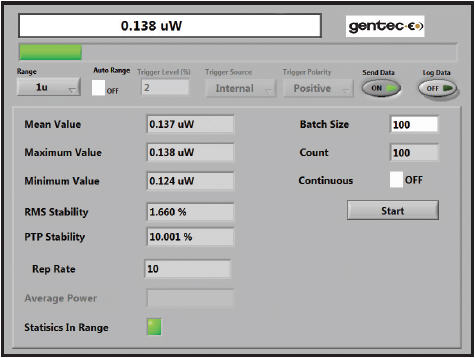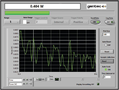 You can select any of our thermal detectors to measure your laser power from a few μW up to 30 kW. We used one of our most sensitive thermopile detectors, model XLP12-3S-H2, to generate the software screen shown on the left. We have selected the “scope” mode, where you can view the live power reading (0.404 W), a bar graph and a strip chart while monitoring the power. This high level screen also provides access to range, trigger, auto scale, and many other monitor functions.