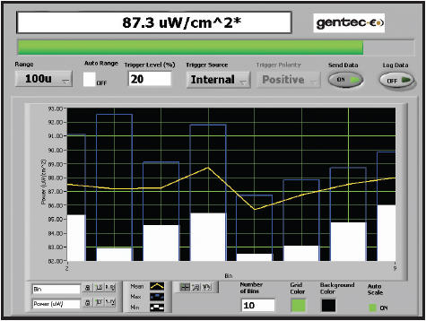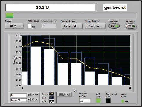 For measurements in the fJ to μJ range, and from UV to near-IR we suggest our PE3B-Si detector. It represents the state-of-the-art in low-end energy detector technology. Take advantage of our proprietary pulse averaging, noise reduction techniques available with M-LINK. In the example shown at the right, we have captured a data set while running in the “averaging” mode. The bars represent minimum (white) and maximum (blue) energy values. The strip chart is based on the average energy value. You get to select the number of “bins” represented here. “Pulse averaging” is available in the statistics screen.
