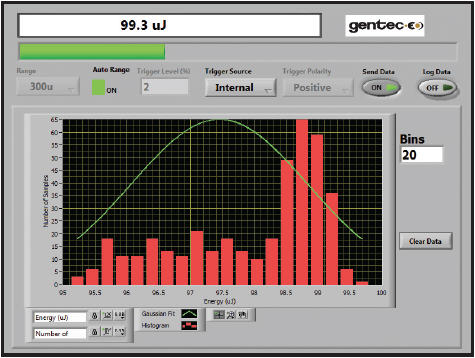 You can select one of our many large area pyroelectric detectors of the QE Series for energy measurements ranging from 50 nJ to 250 J and from DUV to Far IR. To demonstrate this capability, we have selected our QE8SP-B-BL and the M-LINK. We are looking at the “histogram” screen, where you can continue to view the live measurement and a histogram that shows the energy distribution of your data set, along with a best-fit Gaussian curve. Note that you still have access to the instrument controls, like range, trigger, wavelength, etc.