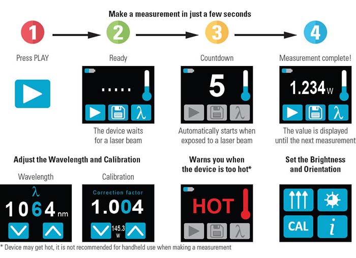 Portable laser power meter for up to 250 W. Easy to clean. Includes 3 measurement modes : SSP, CWP and SSE.